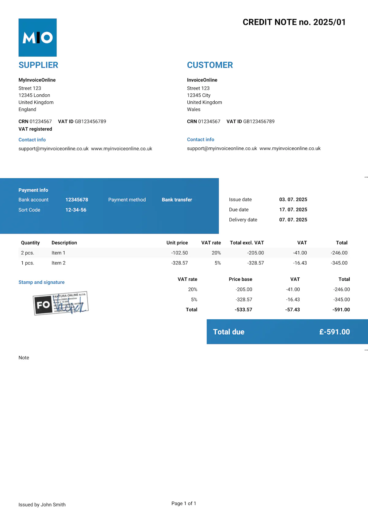 A credit note – sometimes called a credit memo – is used to correct or cancel an invoice that has already been issued. It is most commonly raised when goods are returned, a complaint is upheld, a discount is applied after invoicing or a supply is partially or fully cancelled. A credit note is a legal document that adjusts the net amount and the VAT on the original invoice. On MyInvoiceOnline.co.uk you can generate a credit note in one click directly from the original invoice.