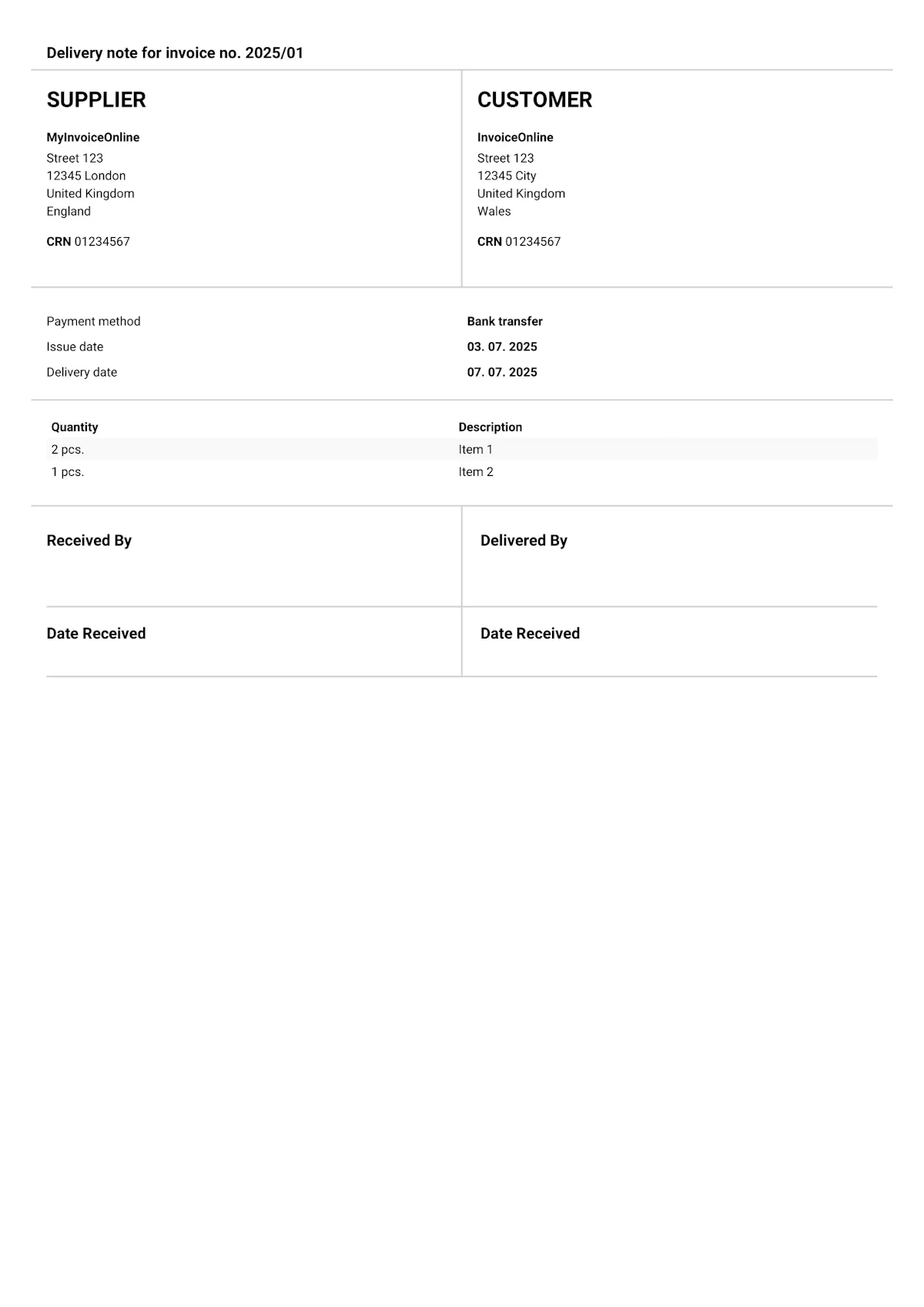 A delivery note is a document that confirms goods have been physically handed over to the customer. It is not legally required in the UK, but in practice it is invaluable – it serves as proof of delivery, a basis for handling complaints and a tool for stock control. On MyInvoiceOnline.co.uk you can generate a delivery note directly from an existing invoice, so you don't need to create it separately.